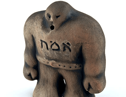 Then, to her surprise, the clay shifted again. Three letters appeared across his chest in Hebrew – aleph, mem, tav. It spelled the Hebrew word emet. Suddenly, her head was swamped. The world spun as if something had sucked the wind from the depths of her body and soul, and she found herself on the floor, staring up at the art studio ceiling. When the dizziness cleared, she found herself looking up at her creation and his lovely brown eyes.