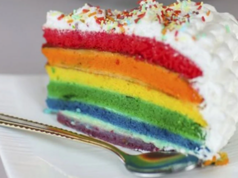 Image is of a slice of cake with rainbow colored interior and white frosting