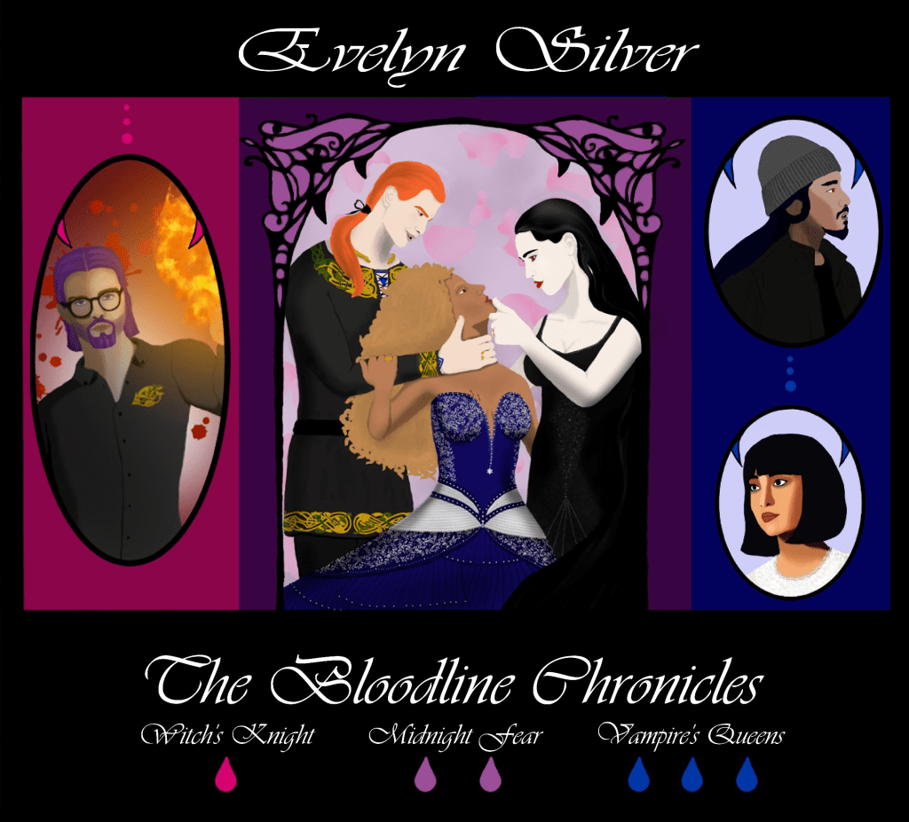 The Bloodline Chronicles is an award-winning contemporary (late 1990s, early 2000s) adult paranormal romance trilogy with The Wild Rose Press. It features queer (primarily bisexual) and polyamorous romances with lots of vampiric, witchy goodness! Scroll down for more info, buy links, and content warnings.